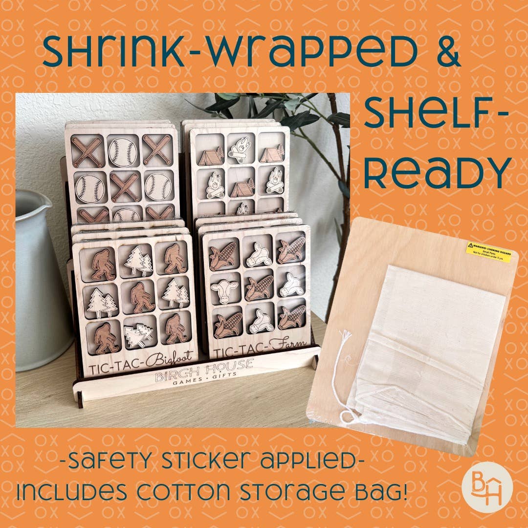 The travel-sized Tic-Tac-Bigfoot is a Bigfoot-themed Tic-Tac-Toe Game Set. It's the perfect gift for PNW'ers, anywhere Bigfoot fans live. Swap sighting stories or plan new adventures while you play. Every board is handcrafted with 2 layers of stunning maple wood and finished with a silky-smooth clear coat for a durable, high-quality finish that will last for generations to come. Playing pieces are clear-coated and 1/4" thick in beautiful cherry and maple woods. Board measures 7” x 5.75” and is 1/2” thick. Every board includes 5 of each playing piece. A natural cotton storage bag is included to hold the board and pieces. Every board is shrink-wrapped and ready to be beautifully displayed in your store.