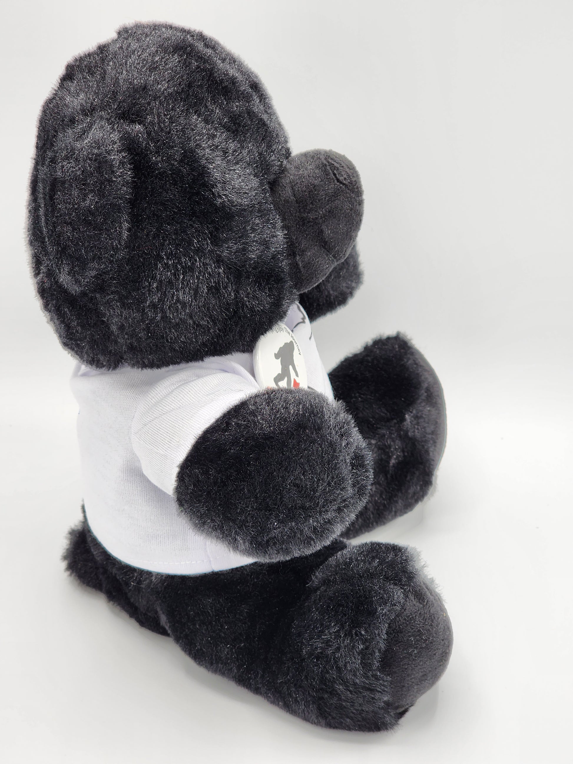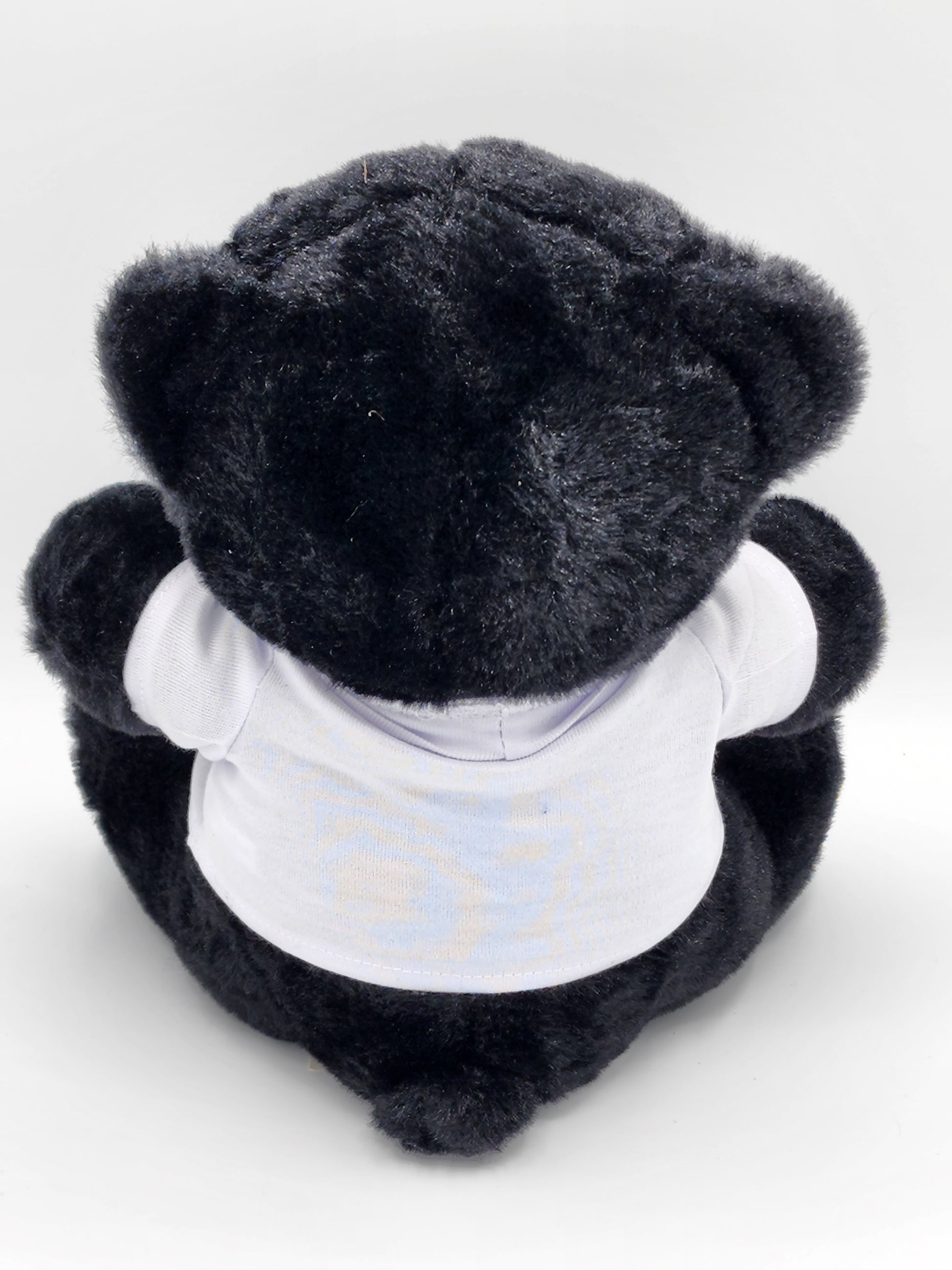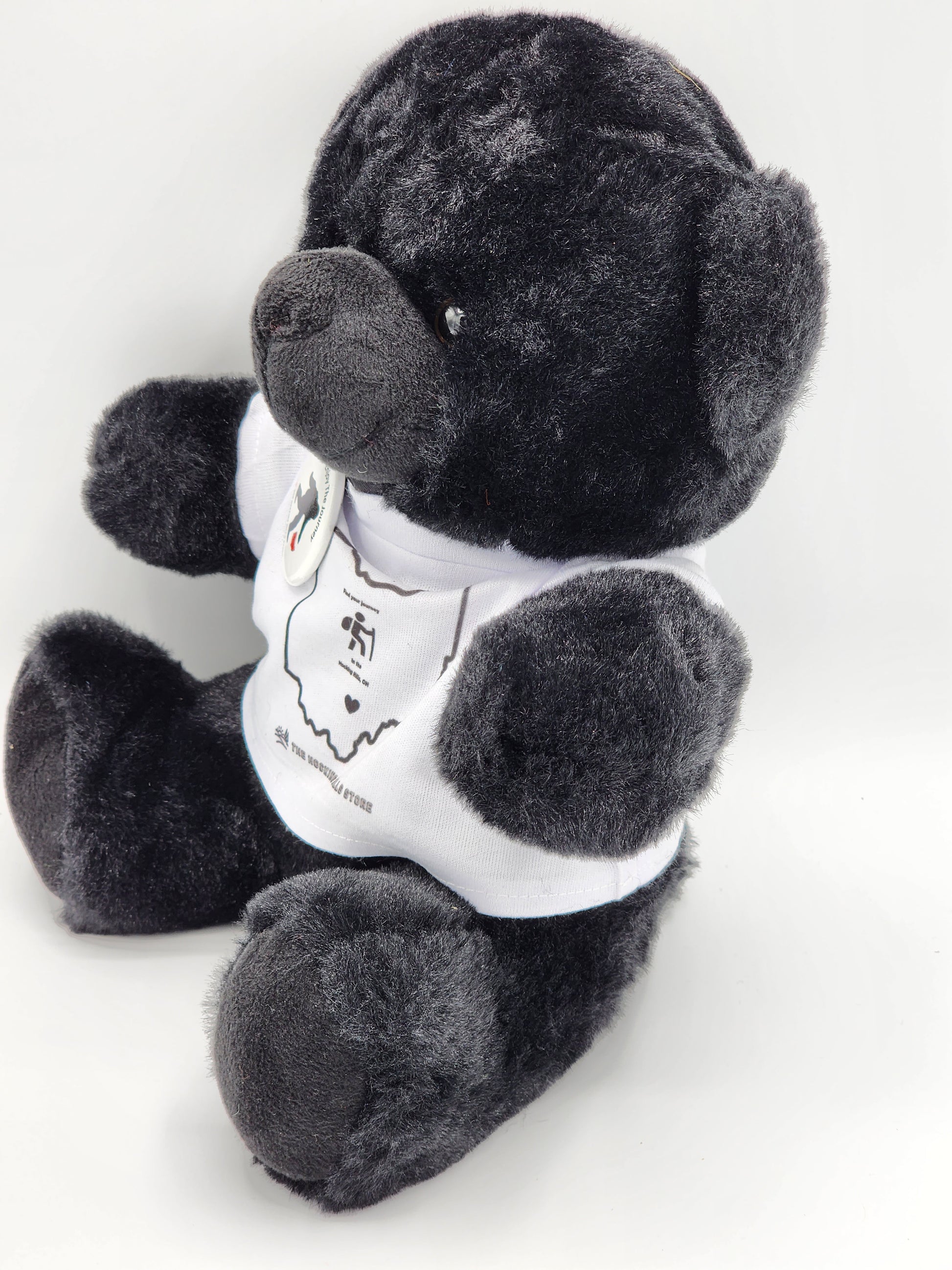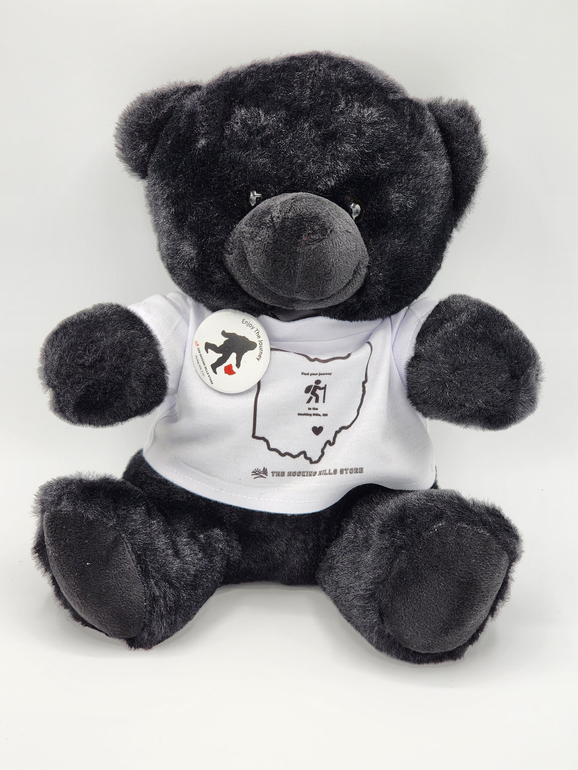 The Hocking Hills Black Bear is a cuddly teddy bear featuring a white shirt with the logo of the International Press Association of Ohio. Perfect for gift shops.