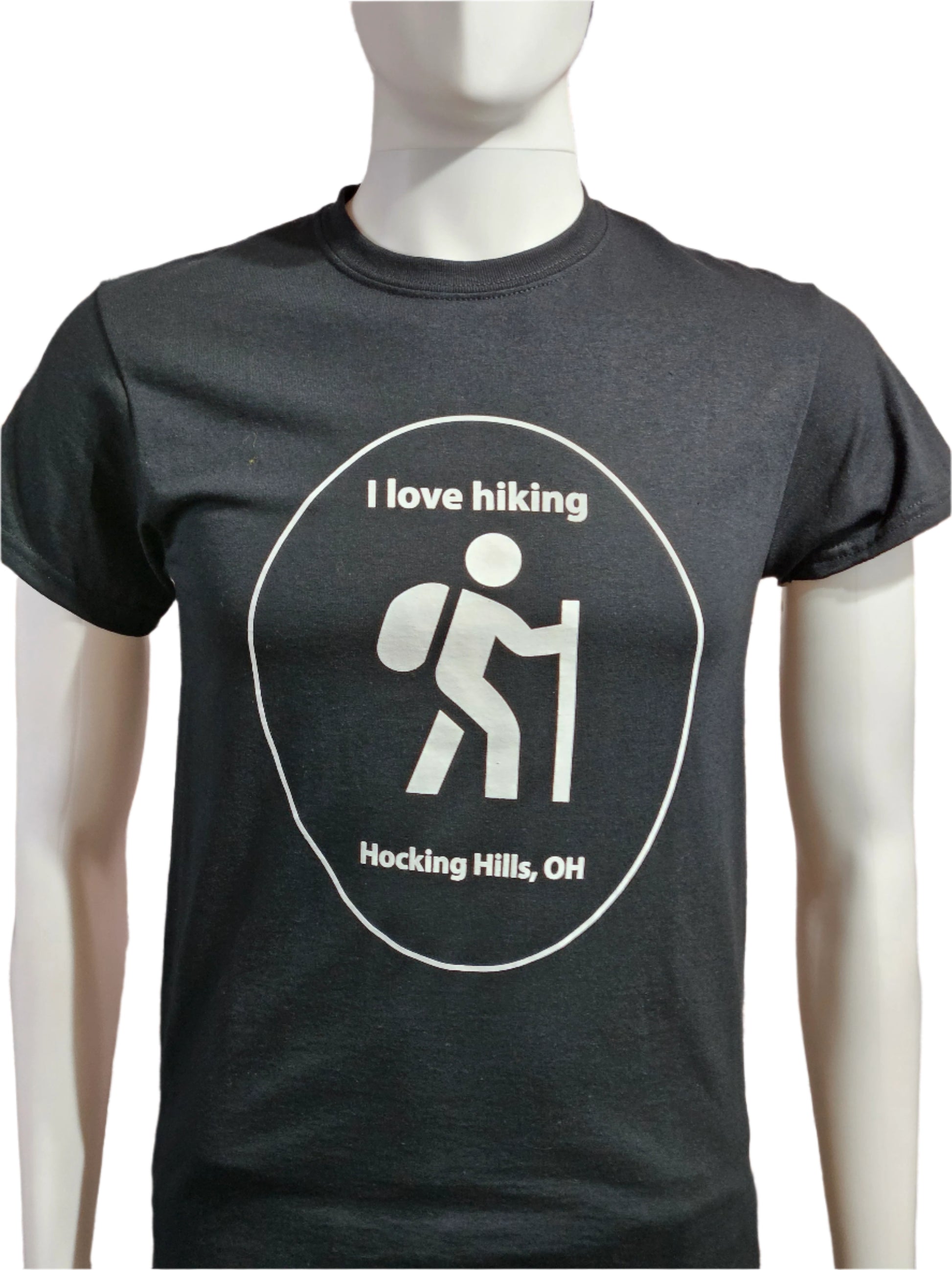 Show your love for hiking in the beautiful Hocking Hills with this stylish black t-shirt. Perfect for outdoor enthusiasts. Get yours today!